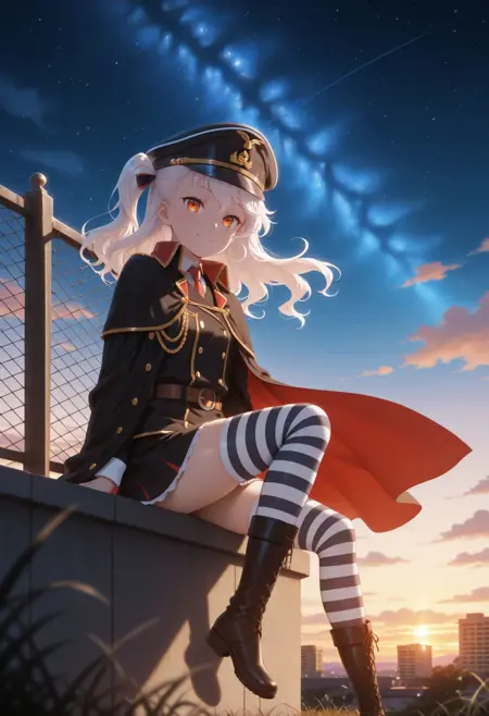 트리거: thea kreutzer, 1girl, long hair, one side up, white hair, orange eyes, military hat, peaked cap, necktie, cape, red necktie,, striped clothes, belt, military uniform, striped thighhighs, skirt, boots