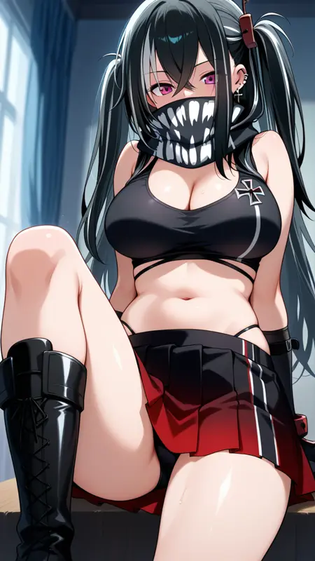 u-47 (eigenen raum) (azur lane), twintails, covered mouth, bandana over mouth, black shirt, black tank top, crop top, bikini, swimwuit, black gloves, fingerless gloves, iron blood (emblem), iron cross, high collar, black bra, medium breasts, large breasts, cleavage, midriff, navel, pleated skirt, red skirt, gradient skirt, thighs, black boots, knee boots, scarf,