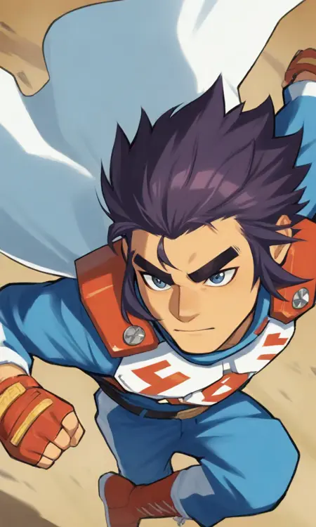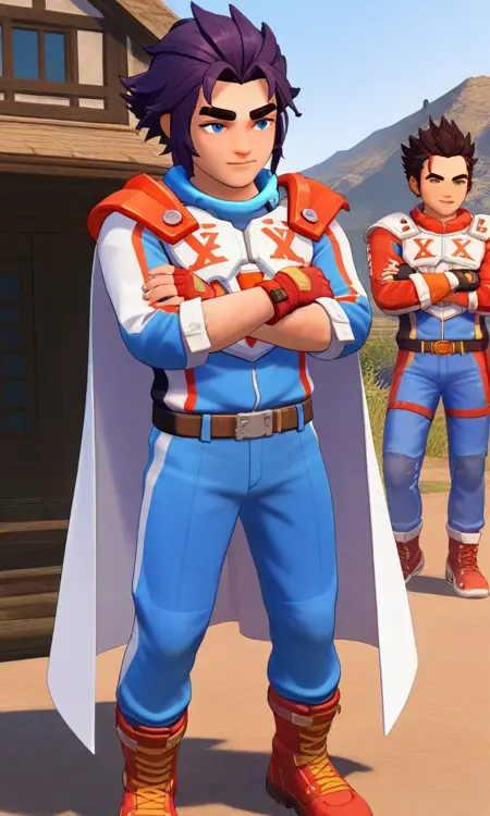 P3n, male, dark purple hair, thick eyebrows, dark blue eyes, blue tracksuit, white cape, red fingerless gloves, white chest piece, red shoulder armor, red boots, belt,
