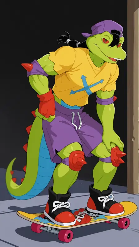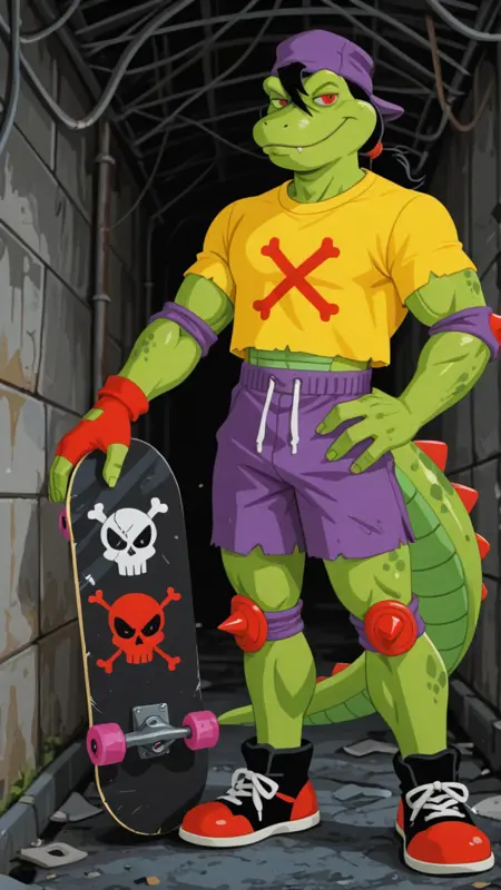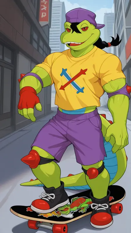 外見タグ: 1boy, lizard boy, monster boy, scaley skin, gecko, green skin, black hair, hair between eyes, ponytail hair, lizard tail, red eyes, red fingerless glove, single glove, kneepads, kneepad with red spike, kneepad with skull, purple elbow pads, purple baseball hat, hat on backwards, yellow graphic shirt, purple shorts, black and red shoes, muscular, strong, masculine,