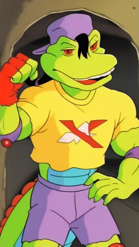 これは1987年のアニメシリーズ『ティーンエイジ・ムータン・ニンジャタートルズ』に登場するモンド・ゲッコーです。オリジナルシリーズのスクリーンキャプチャからトレーニングされました。