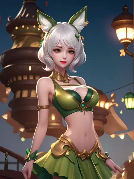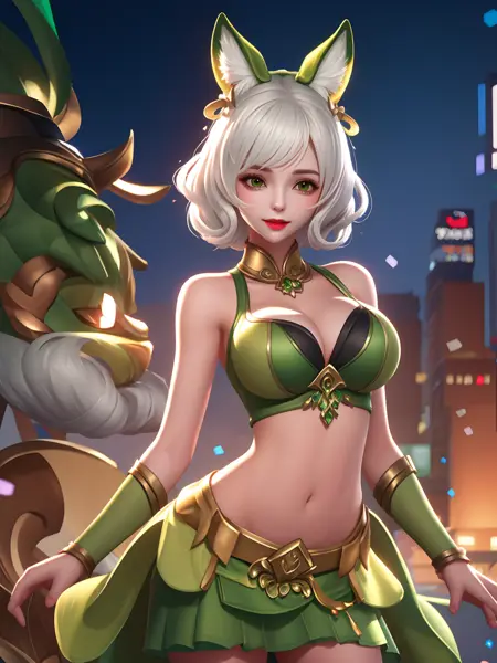 - WZRYdajiRQSB,1girl, looking at viewer, cityscape, night, mature female,green animal ears,green skirt,midriff, hair ornament,short hair, white hair,