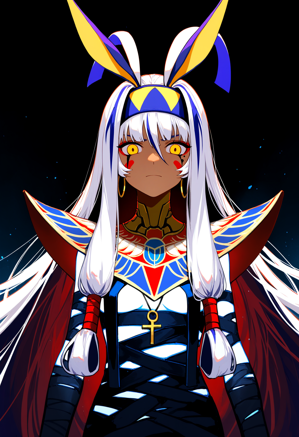 기본 프롬프트: 1girl, nitocris alter, yellow eyes, multicolored hair, jackal ears, white hair, very long hair, colored inner hair, sidelocks, antenna hair, dark skin, facepaint, facial mark, hoop earrings, usekh collar, bandages, hairband