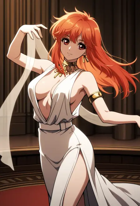 white sleeveless dress, plunging neckline, side slit, long dress, white waist strap, white see-through hagoromo, gold jewelry, neck piece, armlet