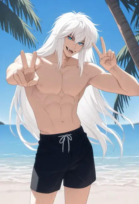 neider, 1boy, white hair, blue eyes, long hair, slit pupils, thick eyebrows