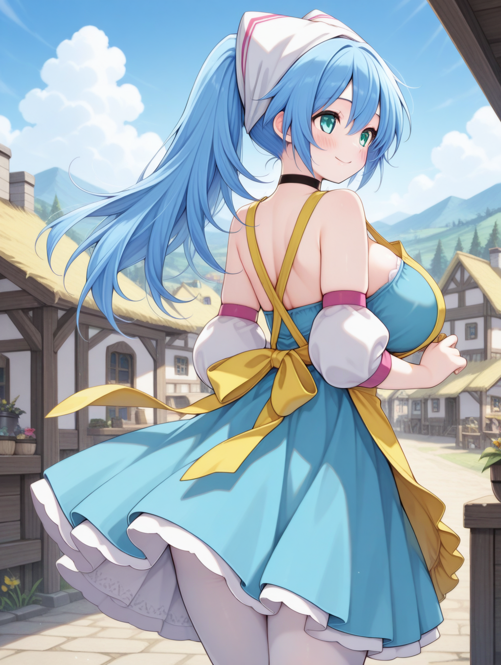 SucMillenia, 파란 머리, 긴 머리, 땋은 머리, 파란 눈, 큰 가슴, 노란 앞치마, 파란 드레스, 리본, 흰색 머리장식, 흰색 팬티스타킹, 어깨 드러냄,