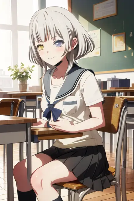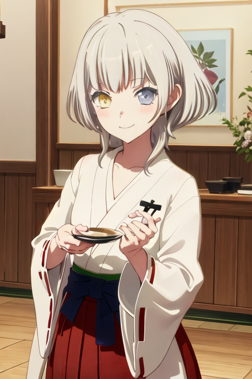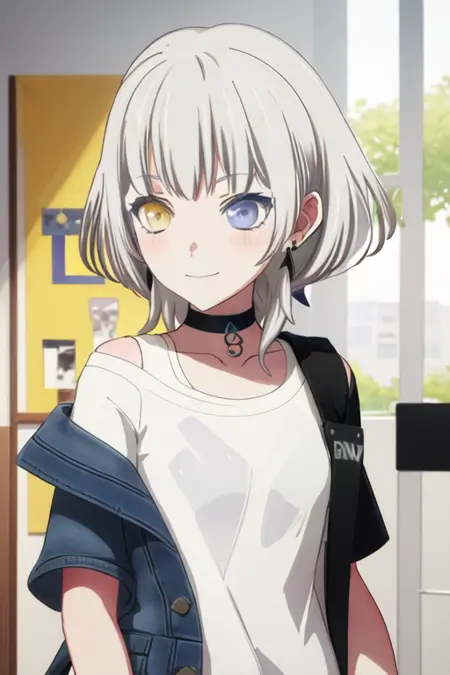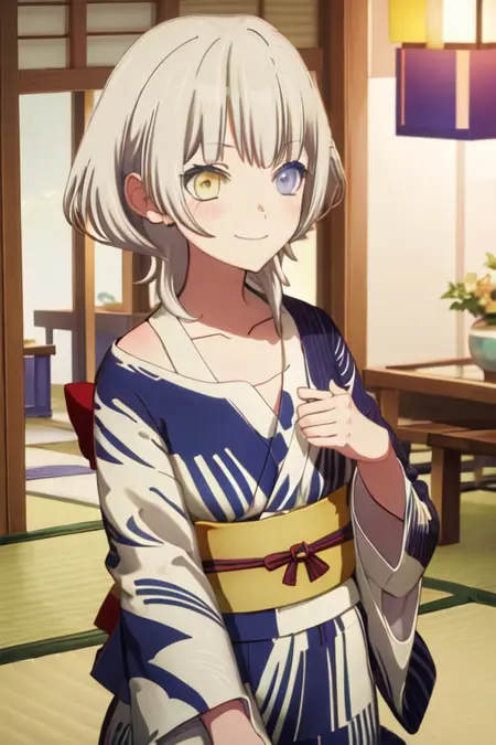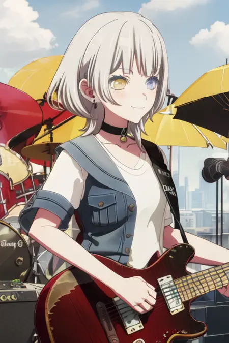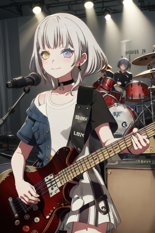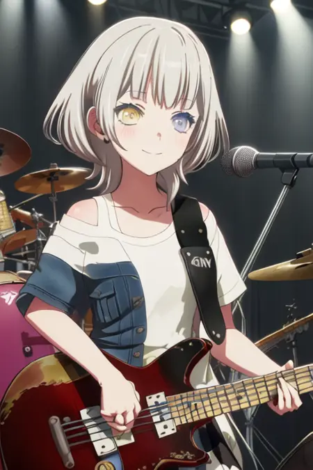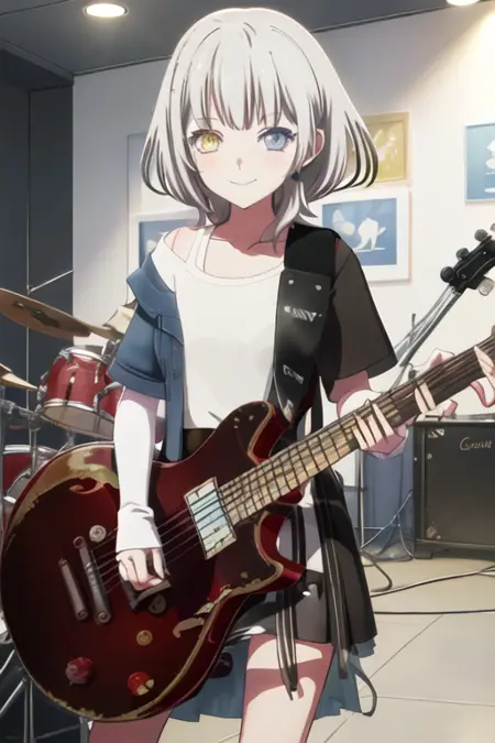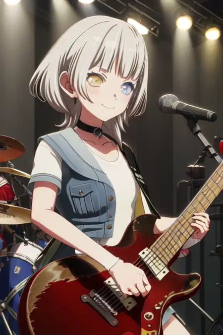トリガーワードはkaname_rana_bangdreamitsmygo、推奨タグはbest quality, masterpiece, highres, solo, {kaname_rana_bangdreamitsmygo:1.15}, short_hair, bangs, blush, grey_hair, collarbone, closed_mouth, yellow_eyes, heterochromia, instrument, smile, blue_eyesです。
