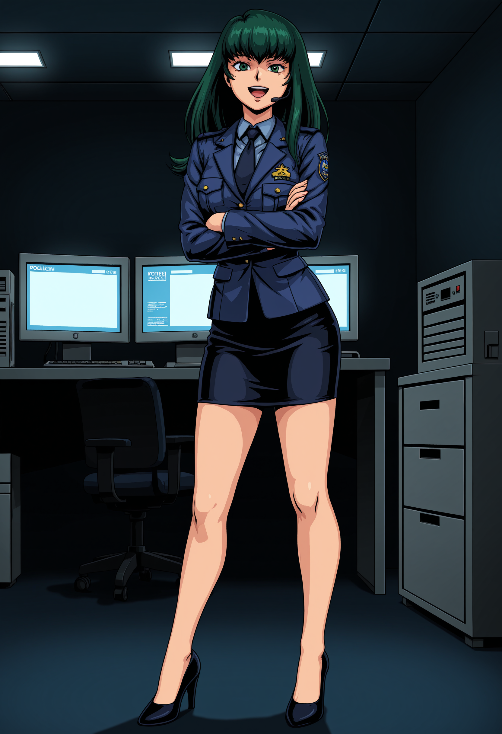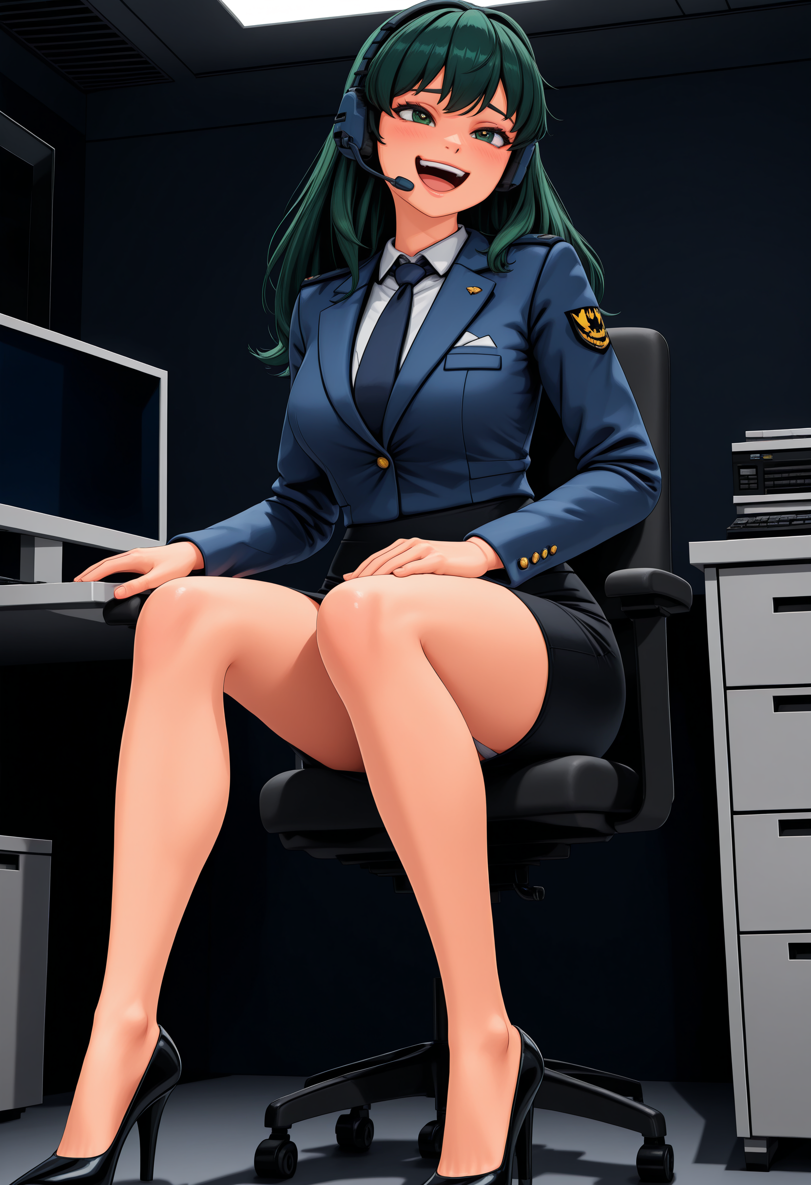 headset,uniform,blue jacket,pencil skirt