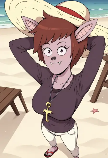 服装: 紫灰色长袖紧身上衣,白色紧身裤,红色凉鞋,金色钥匙吊坠,白色沙滩帽