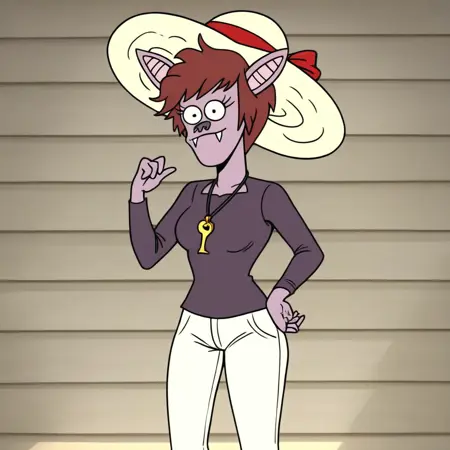 1girl, solo, furry, anthro bat, Stef_RS, 淡薰衣草色皮肤, 红棕色, 短发, 长而尖的蝙蝠耳朵, 小黑鼻子, 可见的蝙蝠獠牙