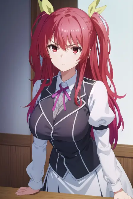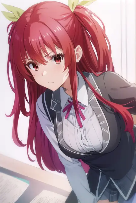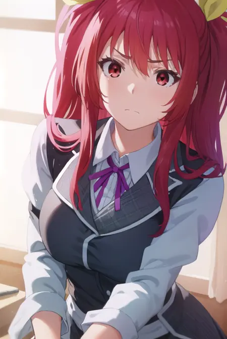 stella vermillion,眼睛之间的头发,发丝垂落,发带,长发,(红眼睛:1.5),红发,两侧上梳,黄色发带,