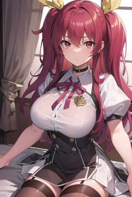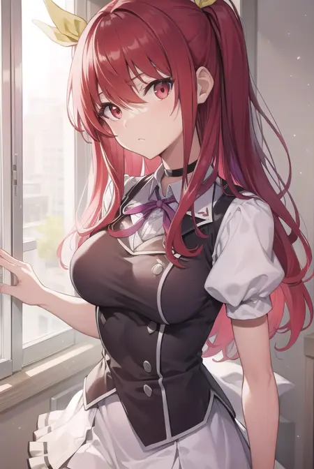 stella vermillion, hair between eyes, hair intakes, hair ribbon, long hair, (red eyes:1.5), red hair, two side up, yellow ribbon,