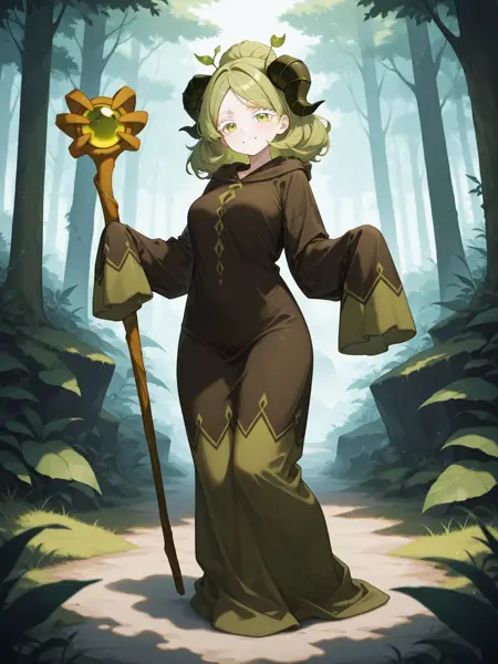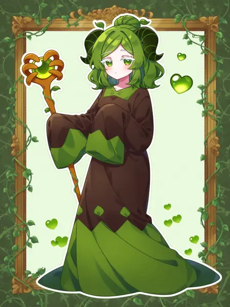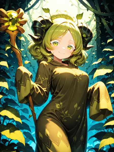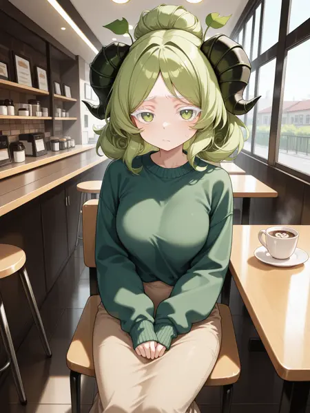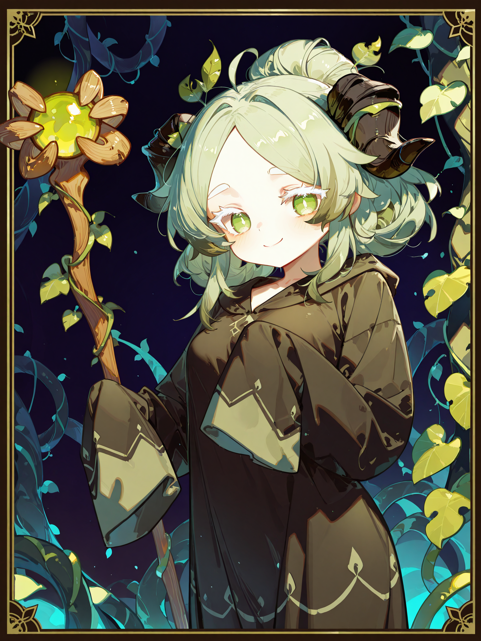 MCCRO, 绿色眼睛, 绿色头发, 白色睫毛, 角, 中长发, 发髻