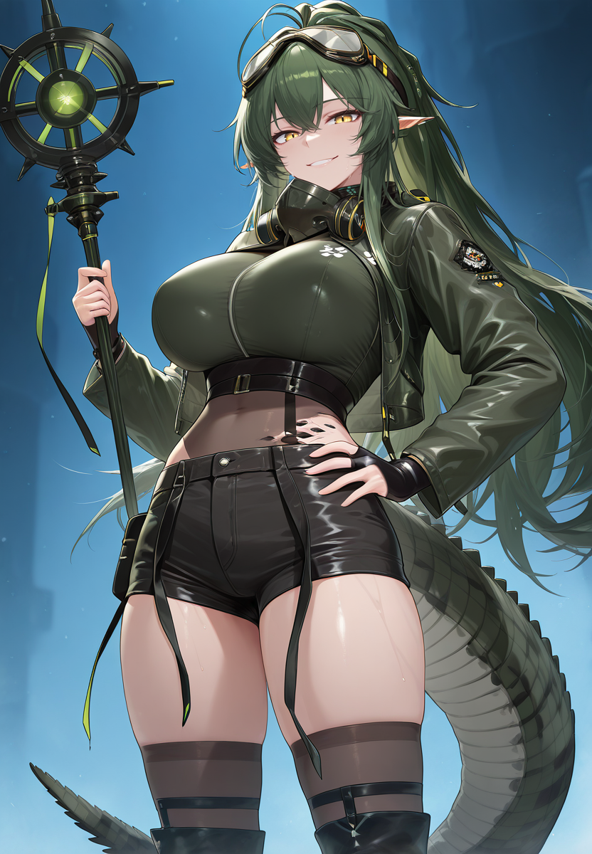 gavial_\(arknights\), 1girl, long hair, yellow eyes, green hair, pointy ears, tail, crocodilian tail,