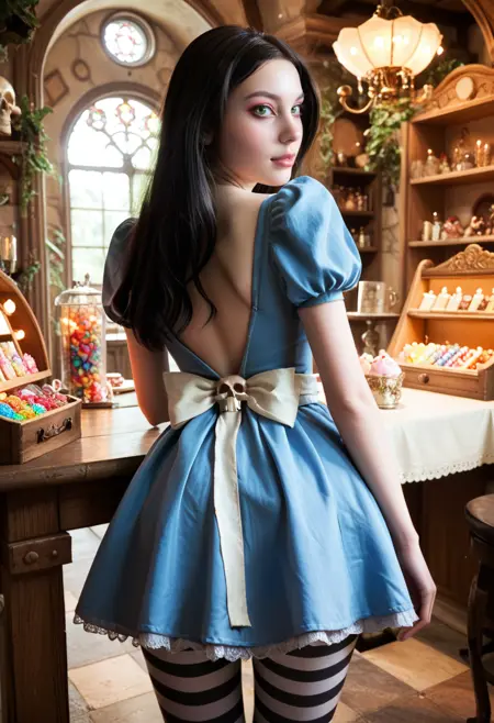 Classical v1.1: In general the same as previous version. Use strength 1.0-0.8, 'necklace' instead of 'horseshoe pendant' and 'blue dress' instead of 'dress'. Skull on bow from her back works a bit worse, but I don't think many people who need this view. Anyway use 'white dressbow, skull' for it, need to manage the strength of them for your case.