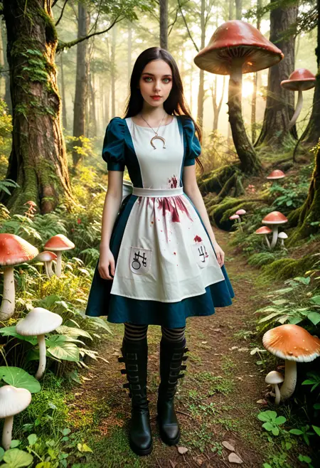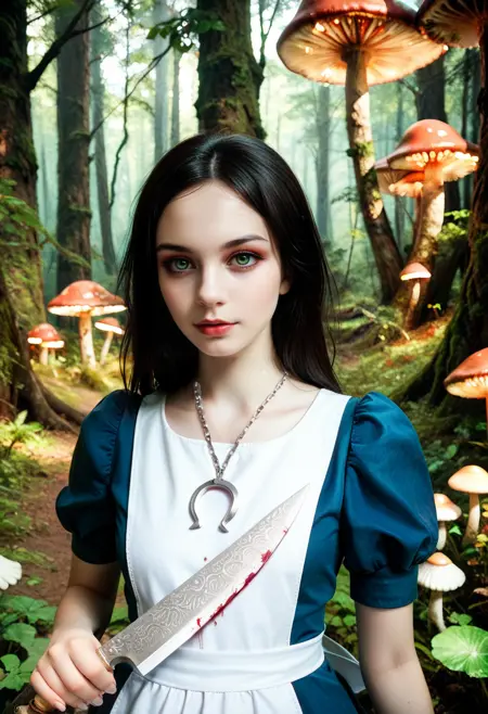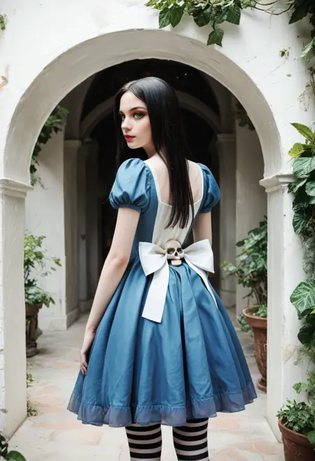 오메가 펜던트 = '말발굽 펜던트'. 이는 유사한 형태를 얻기 위한 트릭입니다. 다양한 토큰을 시도해봤지만, '말발굽 펜던트'가 가장 나은 결과를 줍니다. 드레스 리본 위의 해골도 마찬가지입니다. 실제로 이들은 마스크인데, 데이터셋에서 '해골 마스크'처럼 태깅해봤지만 결과는 최악이었습니다. 해골이 앨리스의 얼굴에 드레스에 인쇄된 듯이 어디에나 나타났습니다.