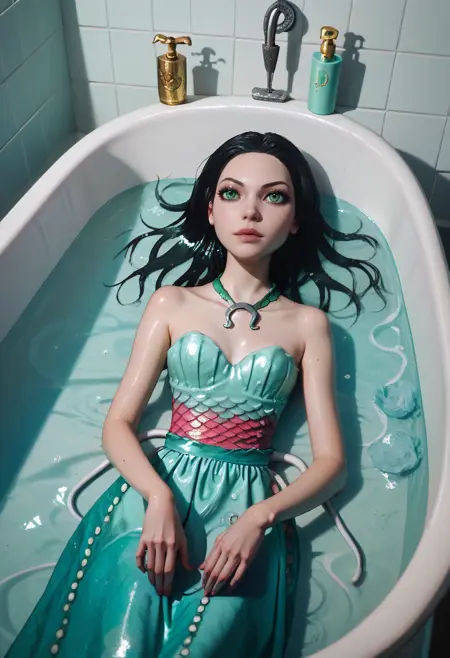 사이렌 v1.0 / 사이렌 v1.1: 강도 1.0-0.8 사용. 이 버전에서도 펜던트가 꽤 잘 작동하지만, 전신 촬영에서 사실적 로라/체크포인트를 사용할 경우 인페인팅이 필요합니다. **앵무어부리물고기 해골**는 전혀 작동하지 않습니다. 'Pony'와 'SDXL'에서 '해골'은 대개 '인간 해골'을 의미하며, 앵무어부리물고기를 인식하지 못하는 것 같습니다. 적어도 저에게는 성공하지 못했습니다. 대안으로 '그녀의 허리 뒤에 매단 앵무어부리물고기 해골'을 강도 약 0.6로 사용하면 해골이 덜 인간적으로 보입니다. 일리움은 가끔 나타나고 가끔 나타나지 않으며, 일반적으로 이 부분에 큰 기대를 하지 않는 것이 좋습니다. **'Peals'**는 드레스의 작은 원형 패턴을 안정화하는 데 도움이 될 수 있습니다. 동시에 더 질감 있게 만듭니다. 예시에서 v1.0의 제 프롬프트에는 실수로 'AMRDD'를 사용했지만 정확히는 'AMRSD'였습니다. 그러나 이는 결과에 큰 영향을 주지 않을 것입니다.