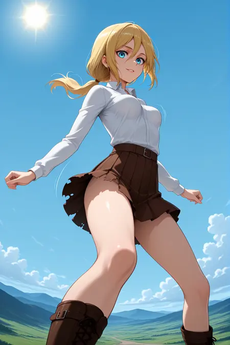パラディスuniform:茶色のジャケット、衿付きシャツ、白いシャツ、開いたジャケット、短めのジャケット、パラディス軍服、ベルトのバックル、茶色のベルト、長袖、ぴったりしたパンツ、白いパンツ、太ももストラップ