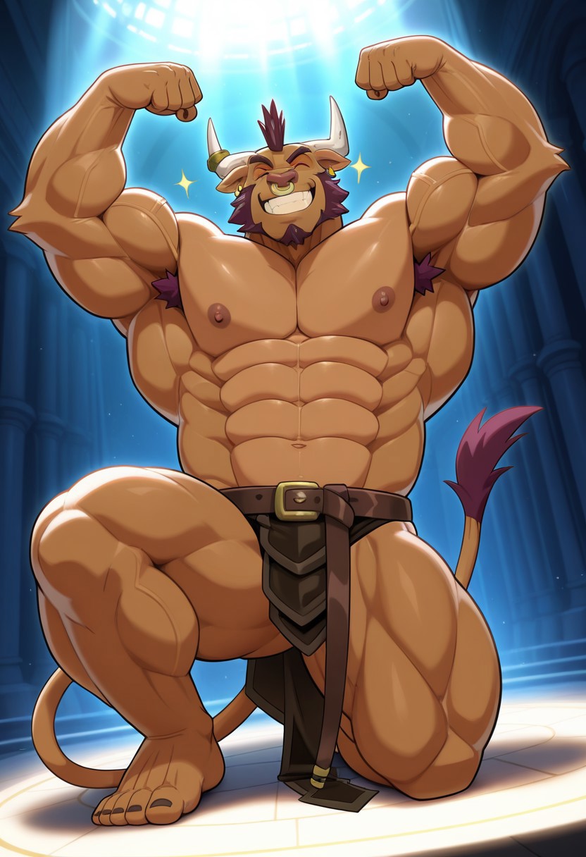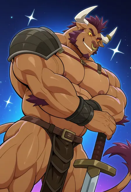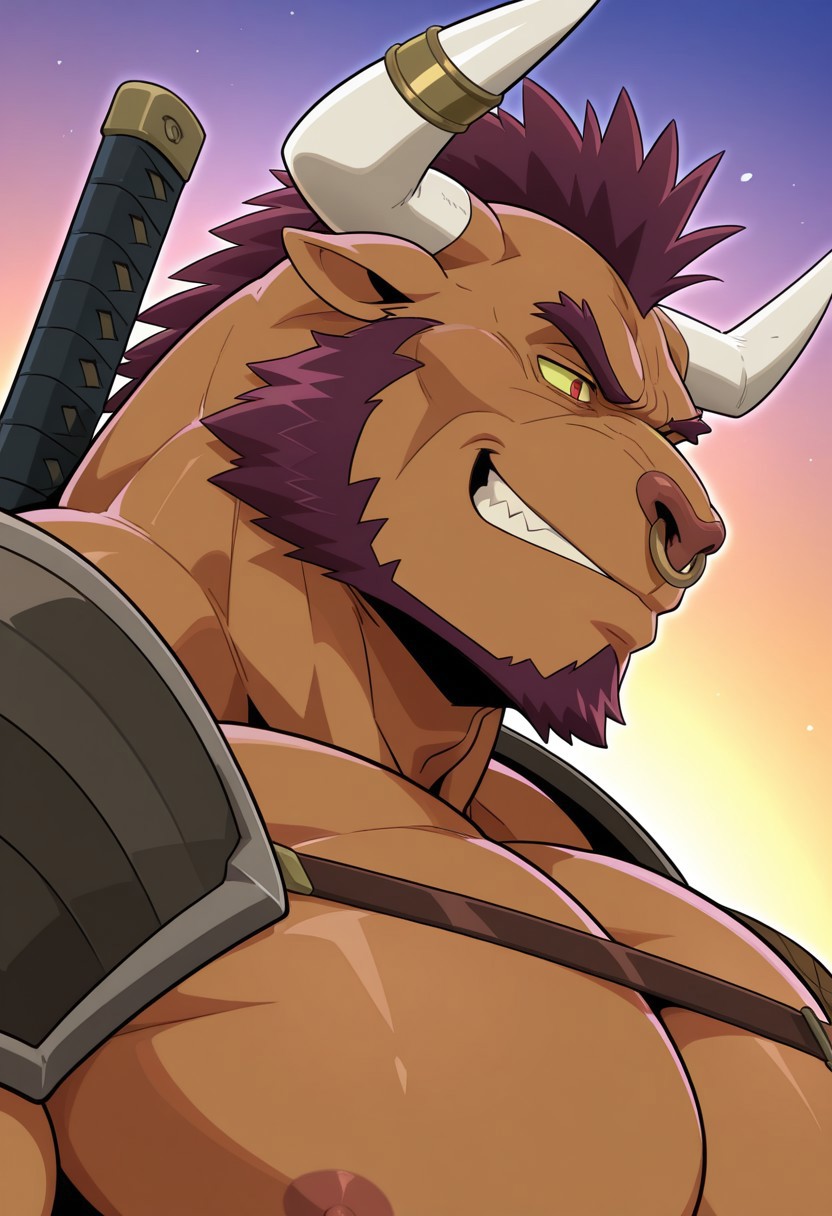 Reinforcement Prompts: "furry, minotaur, tail, yellow sclera, red eyes, mohawk, nose ring, horn ring, earrings, muscular, manly, mature male, bara, large pectorals, alternate pectoral size, median furrow"