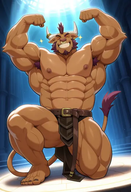 强化提示:“毛茸茸的、牛头人、尾巴、黄色眼白、红色眼睛、莫霍克发型、鼻环、角环、耳环、肌肉发达、男性化、成熟男性、 bara、发达的胸大肌、不对称胸肌、中央沟”