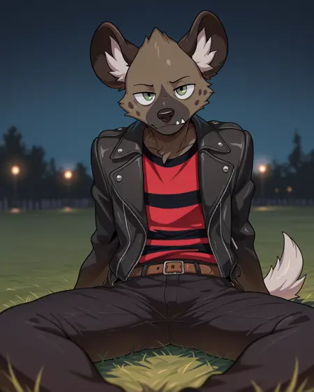 黒いジャケット、ストライプシャツ、ベルト、黒いズボン、