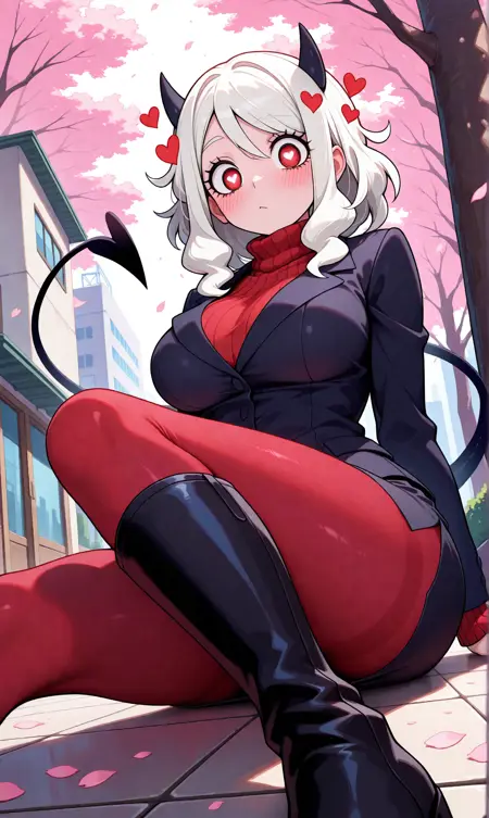 黒いジャケット, 長袖, 赤いセーター, 黒いスカート, ペンシルスカート, 赤いレギンス, 黒いブーツ, ネイキッドブーツ