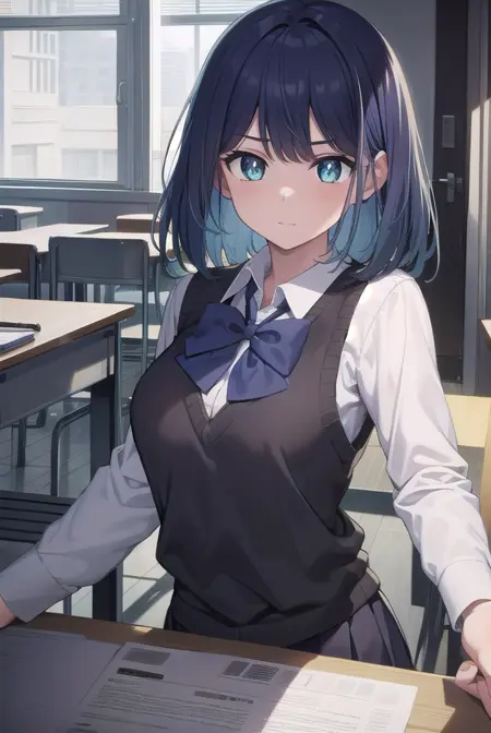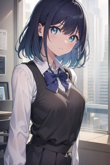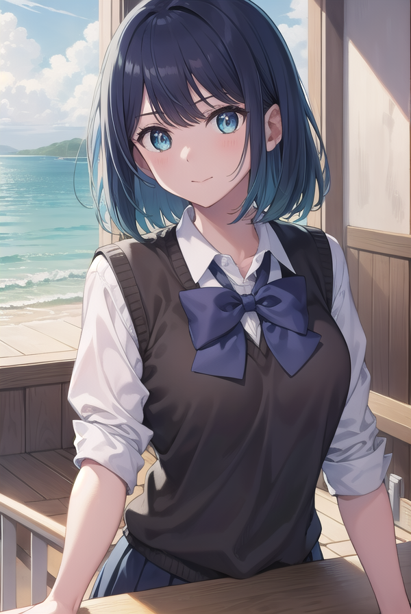 black sweater vest, blue bow, blue bowtie, bow, bowtie, collared shirt, long sleeves, puffy sleeves, school uniform, shirt, sweater vest, white shirt,
