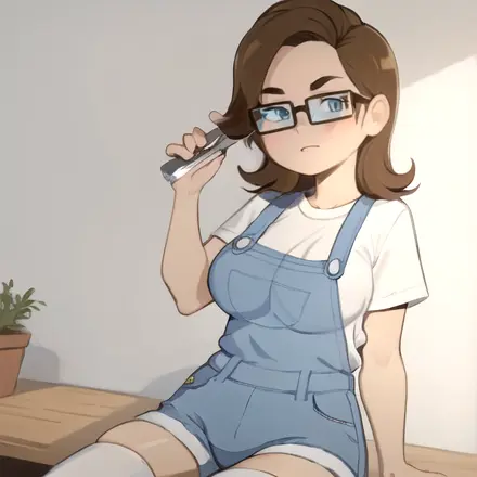 サバースパーク、オーバーオール、白い太ももハイ、眼鏡、黒いスニーカー、茶色の髪、カウボーイショット、中程度の胸、オレンジのシャツ、単独