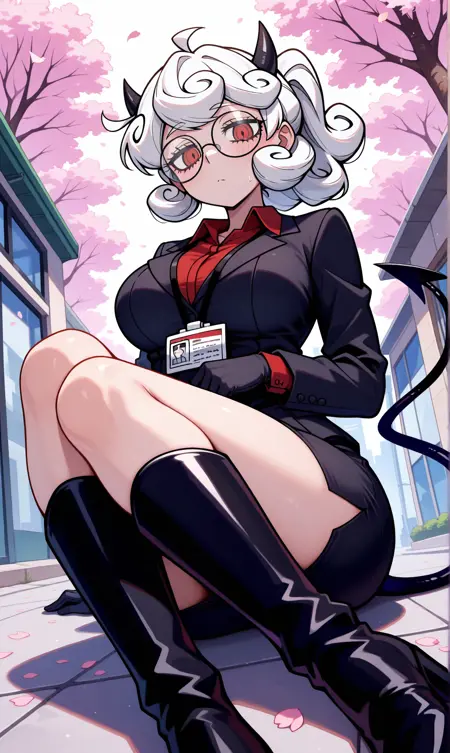pandemonica (helltaker), 빨간 눈, 흰 머리카락, ahoge, 악마 뿔, 검은 뿔, 악마 꼬리, 원형 안경