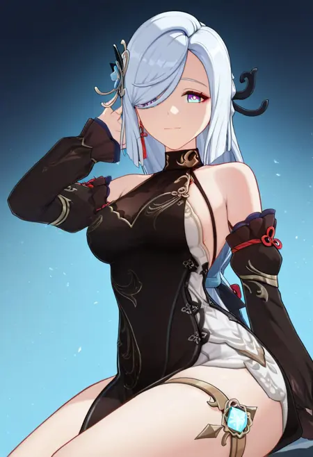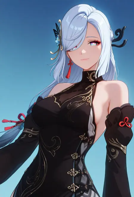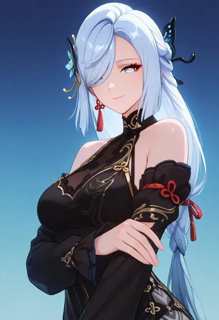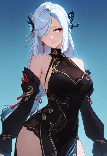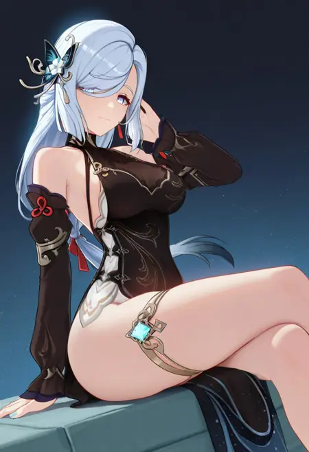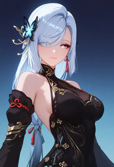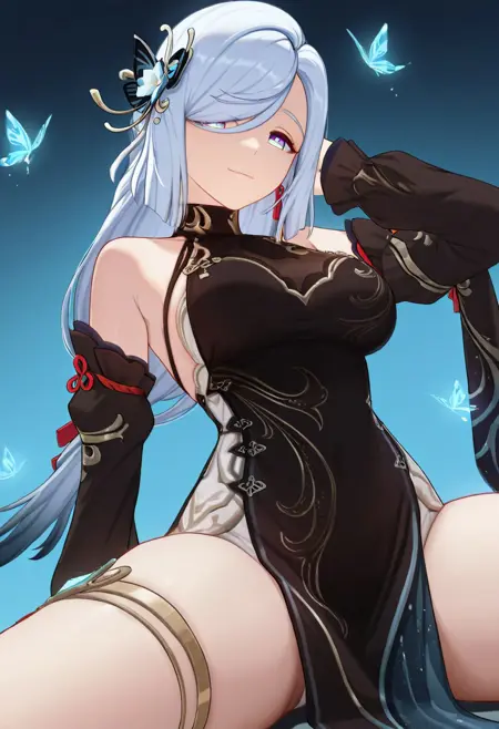 | トレーニングワード | Shenhe (Genshin Impact), long hair, ice-blue hair, braided hair, single braid, hair ornament, butterfly hair ornament, flower hairpin, back ribbon bow, multicolored eyes, soft lips, tall and curvy, large breasts, rostflower Dew Skin, elegant dress, qipao, black and blue cheongsam, high slit dress, mandarin colar, gold embroidery, floral patterns, transparent chest window, red ribbon accents, golden details, gem details, open back dress, detachable sleeves, long flowy sleeves, white underwear, hip ornaments, high heels, コピーしました! |