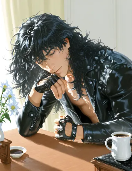 hud_80srckhr, solo, realistic, messy hair, jewelry, leather, necklace, leather jacket, jacket, long hair, brown hair, tank top,