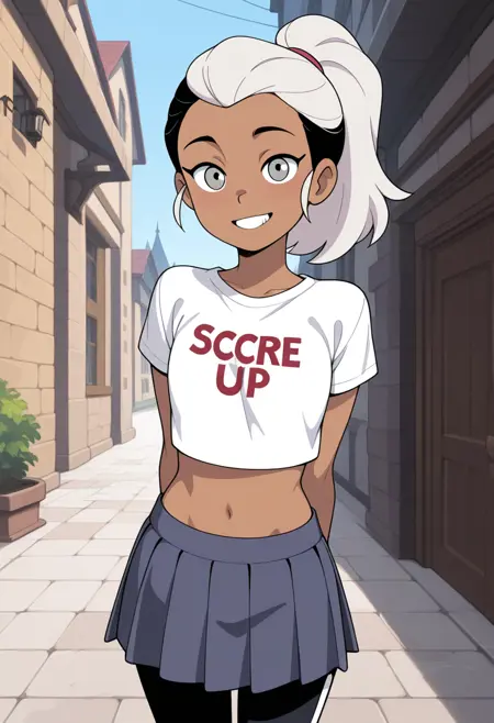 - Skara_Owl_House, 深色皮肤女性, 银色眼睛, 马尾辫, 多彩头发, 白发, 黑发