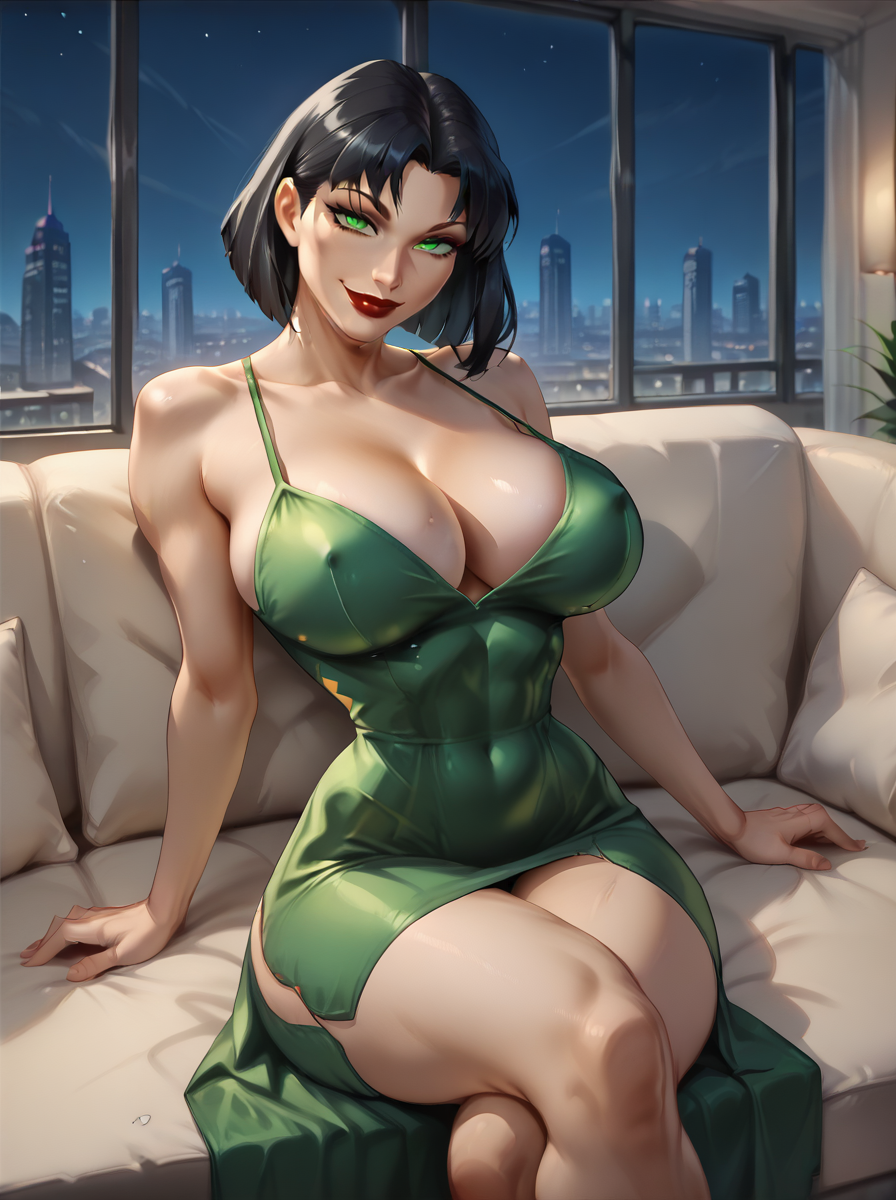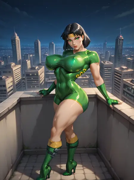衣装: グリーンのボディスーツ、裸の太もも、グリーンのハイヒールブーツ、指なし手袋、イエローのヘッドバンド