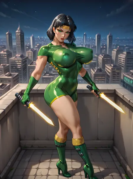 복장: 녹색 바디수트, 드러난 허벅지, 녹색 하이힐 부츠, 손가락 없이 만든 장갑, 노란 머리띠