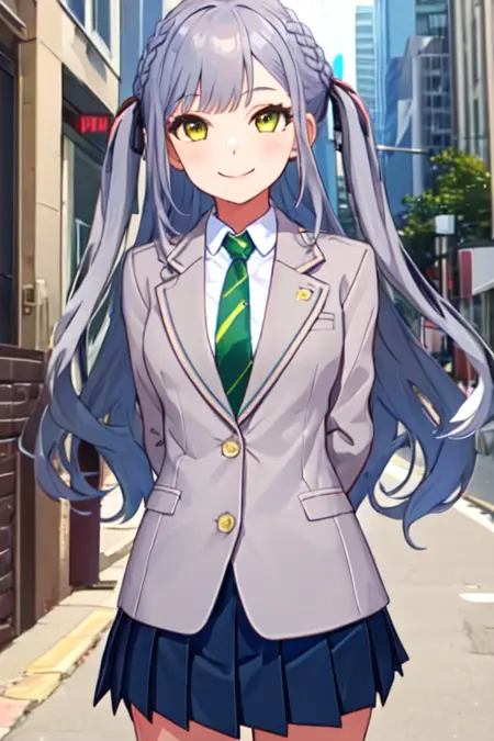 haneoka 校服(西装外套款):togawa sakiko,发辫,绿色条纹领带,白色领衬衫,(灰色西装外套),绿色百褶裙,