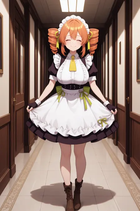 그녀의 전형적인 외모를 위해 "머리 리본, 흰색 머리장식, 노란색 넥타이, 짧은 넥타이, 칼라가 있는 드레스, 검은 드레스, 프릴이 있는 드레스, 볼륨 있는 짧은 소매, 메이드 앞치마, 손가락 없는 장갑, 갈색 부츠"를 추가하세요.
