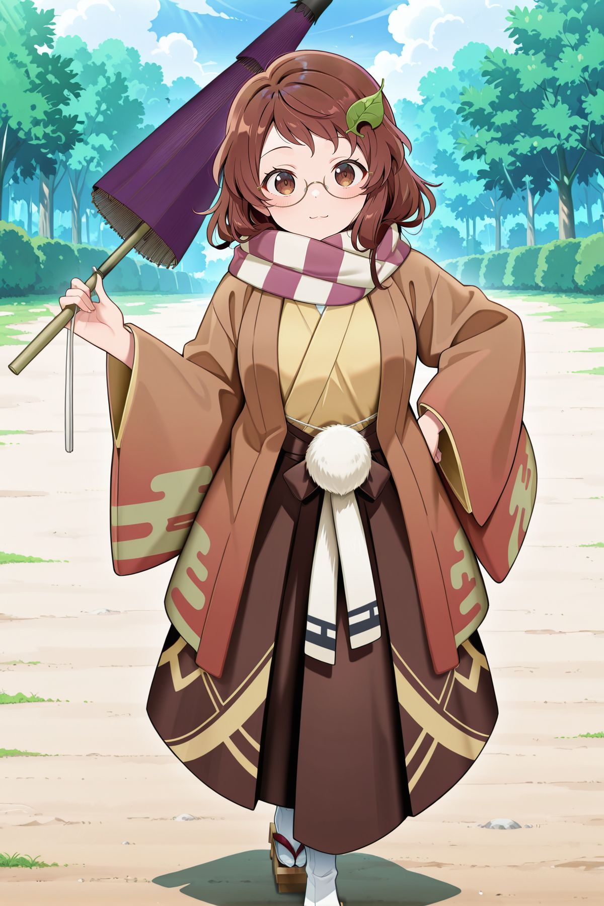 futatsuiwa mamizou, 1girl, solo, brown eyes, brown hair, long hair, semi-rimless eyewear, leaf on head, no tail, no ears,, futatsuiwa mamizou \(human\), alternate hairstyle, alternate costume, orange kimono, checkered clothes, checkered scarf, tanuki, white socks, geta,