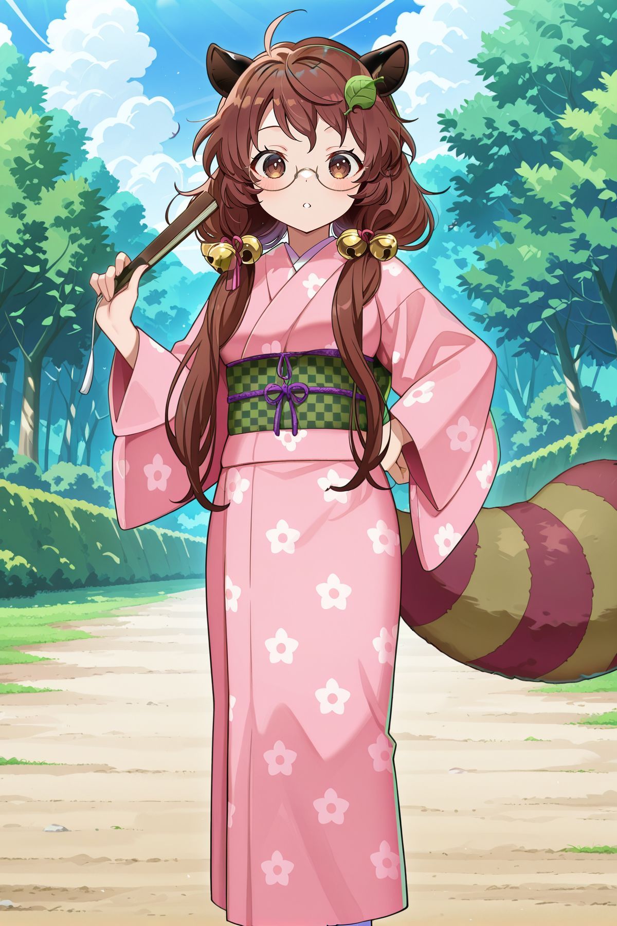 futatsuiwa mamizou, 1girl, solo, brown eyes, brown hair, long hair, low twintails, hair ornament, jingle bell, raccoon ears, raccoon tail, semi-rimless eyewear,, alternate costume, alternate hairstyle, japanese clothes, pink kimono, long sleeves, wide sleeves, green obi, checkered obi, purple obijime, sash,