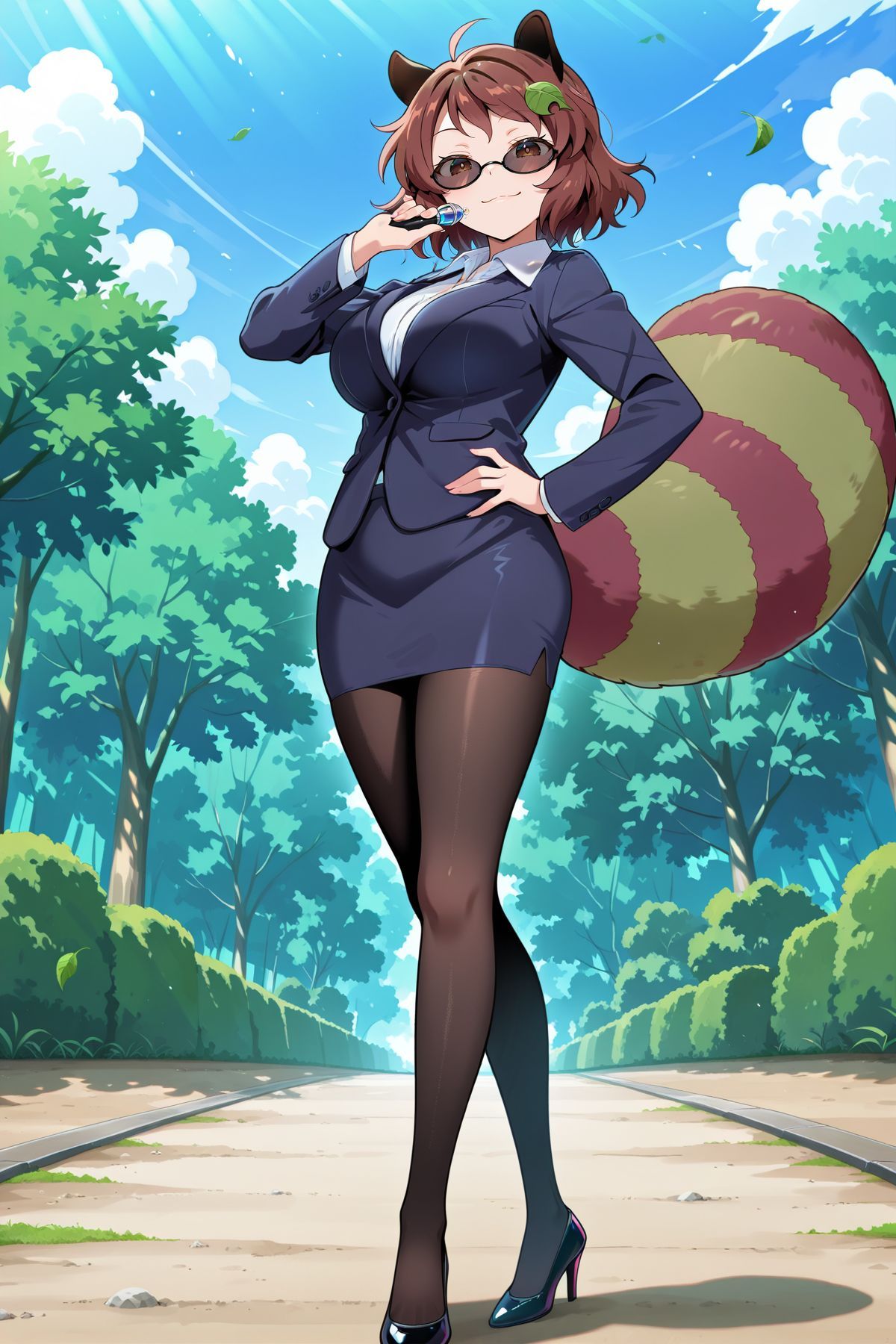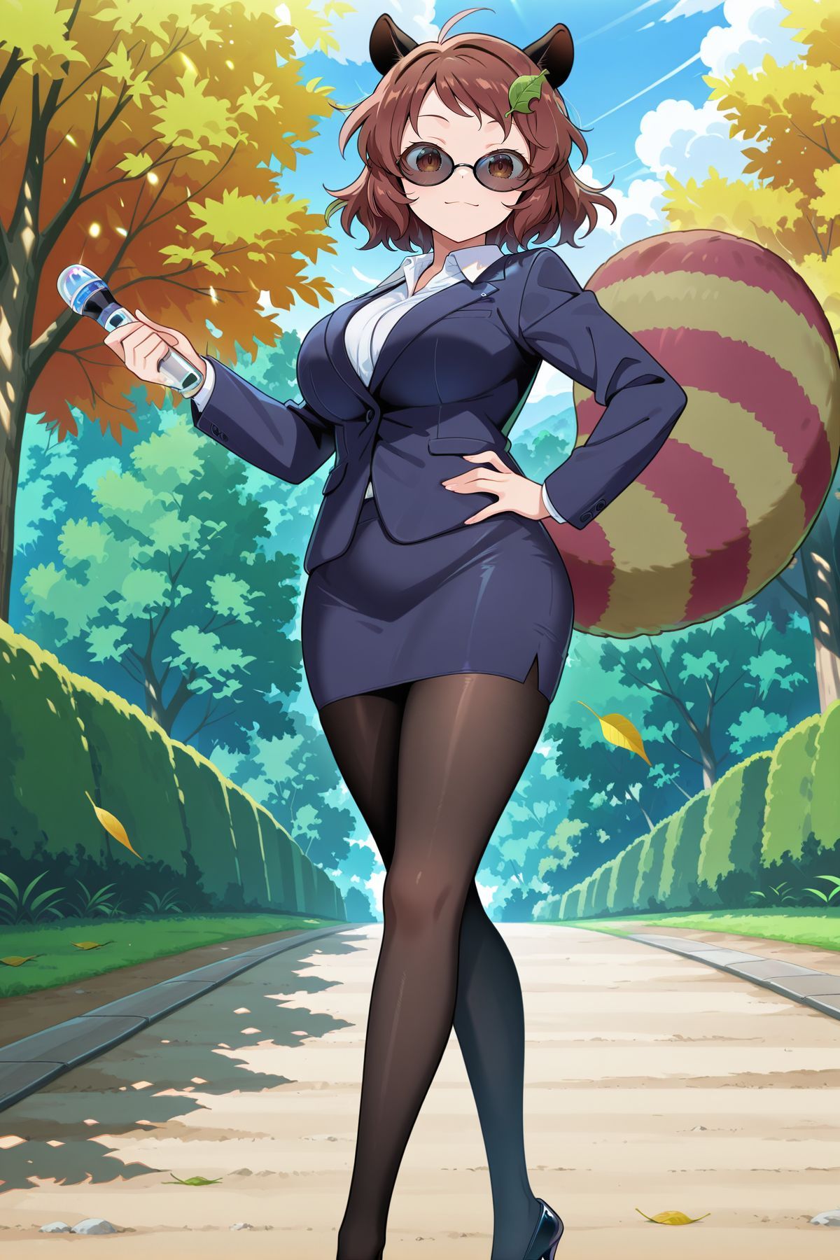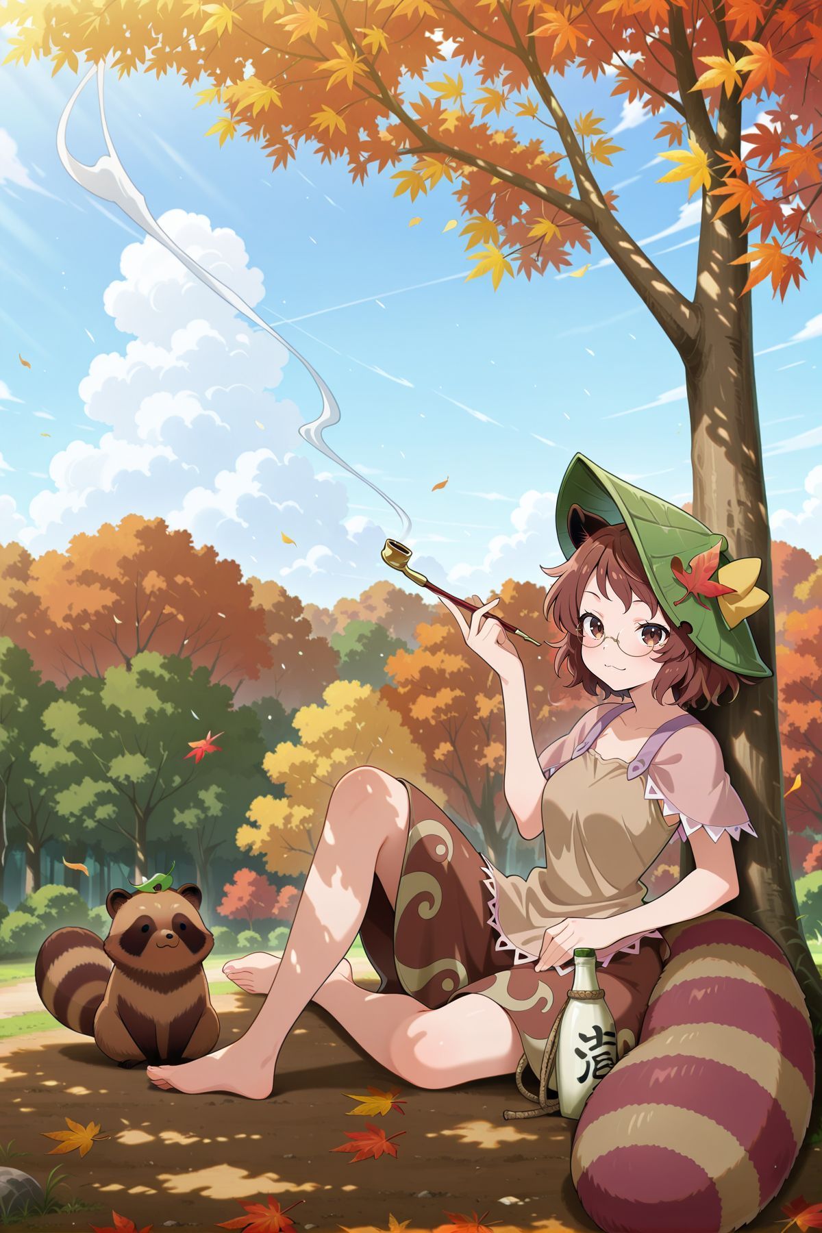 futatsuiwa mamizou, 1girl, solo, brown eyes, brown hair, short hair, raccoon ears, raccoon tail, semi-rimless eyewear, leaf on head, green headwear,