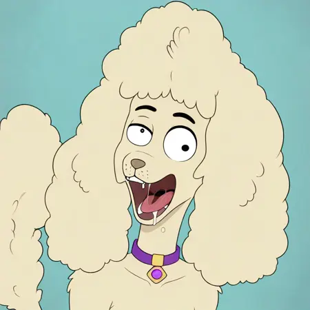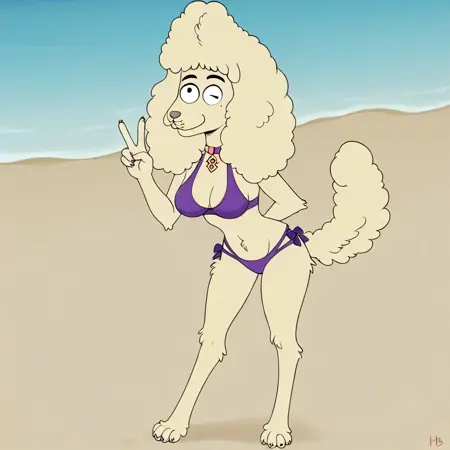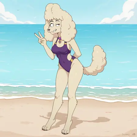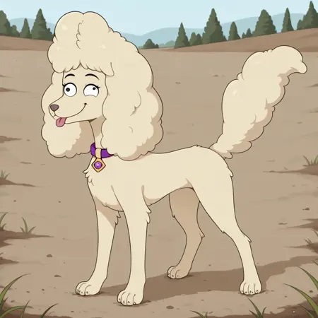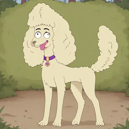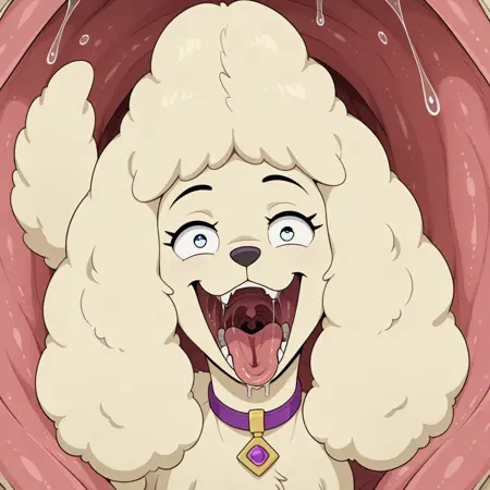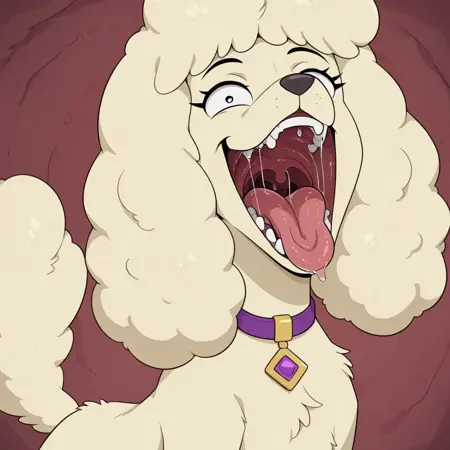 dog, dog girl, poodle, tan fur, puffy tail, puffy ears, purple collar, derp face,