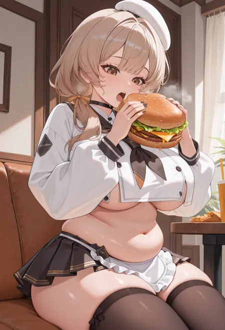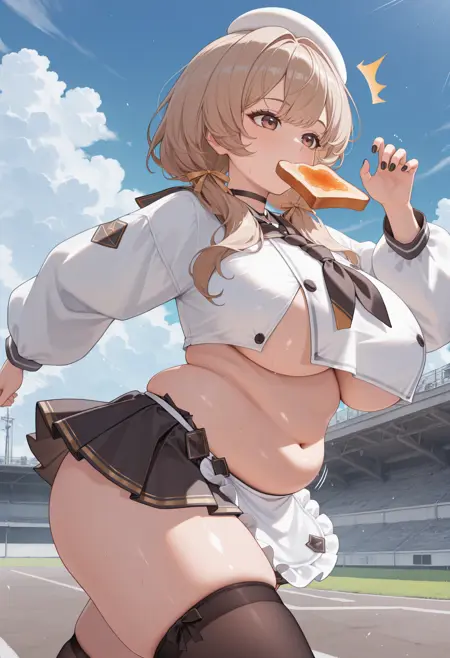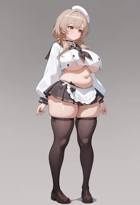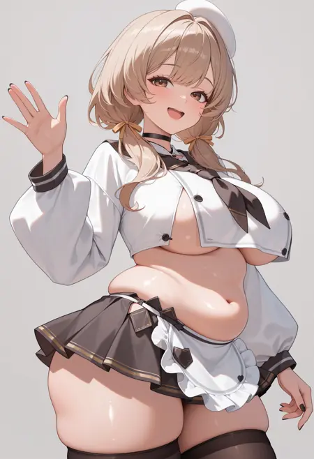 brdy, 갈색 눈, 통통한, 연한 갈색 머리카락, ahoge, 낮은 트윈테일, 어깨에 걸친 머리카락, 긴 머리, 머리끈, 흰색 베레모, 검은 목걸이, 큰 가슴, 해군 칼라, 검은 넥커치ef, 크롭 탑, 흰색 셔츠, 긴 소매, 언더부브, 배꼽, 복부, 배, 주름치마, 검은 치마, 미니 스커트, 허리 앞치마, 검은 허벅지 스타킹, 두꺼운 허벅지, 피부 홈, 검은 손톱