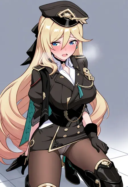 黒とゴールドのチョーカー、ターコイズのイヤリング、ゴールドとターコイズの装飾が施された黒い帽子、黒い髪リボン、ゴールドのイーパレット、黒とゴールドのタッセル、白いアンダーシャツ、黒とゴールドの二列ボタンの軍服、黒とターコイズのマント、黒とゴールドのジャケット、黒とゴールドのスカート、ショートドレス、黒とゴールドのコルセット、ゴールドのエンブレム、ゴールドのチェーン、ターコイズのリボン、パンスト、黒とゴールドの装甲付き太ももブーツ、黒い手袋、非対称の手袋、3/4ソケット