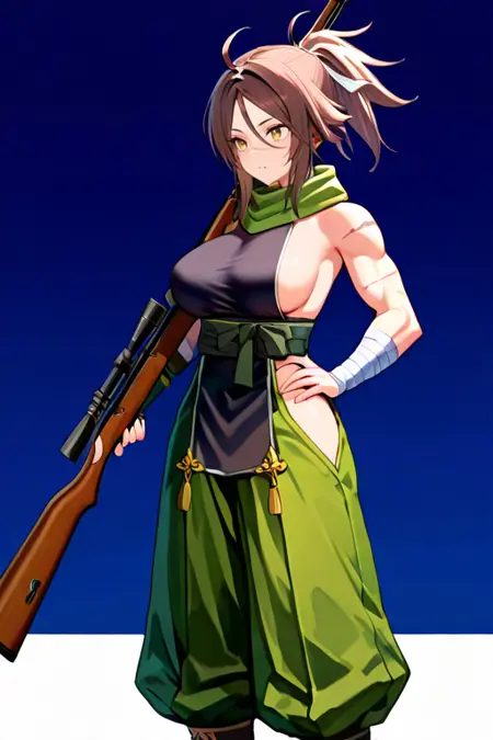 大乳房, zenjuboudef, 裸露肩膀, 侧乳, 和服, 露背装束, 绷带手臂, 黑色腰带, 绿色长裤, 髋部通风口, 日式盔甲, 草鞋,