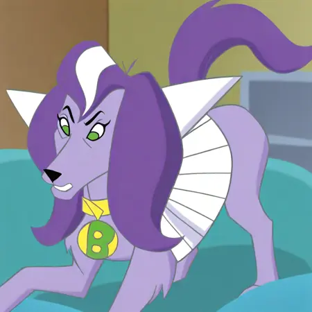 female, furry female, feral, solo, dog, purple fur, purple hair, white highlights, green eyes, black nose, tail