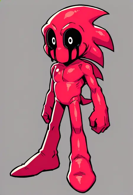 MeathogEXE, 1boy, body shape similar to that of Sonic, bright fleshy red body, no arms, armless, mouthless, earless, noseless, large white eyes, black sclera, black tears, horror,