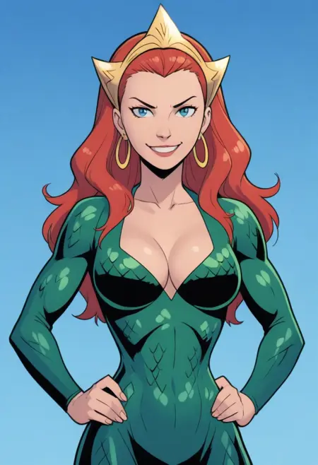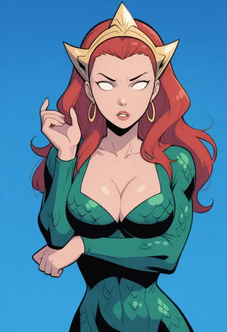 | Trained Words | 1girl, solo, DC Comics, Mera, blue eyes, gold crown, red hair, long hair, green bodysuit, scaled bodysuit, scales, cleavage,Copied! Optional: sleeveless, gold bracers, no pupils, glowing eyes,Copied! Optional: Superpowers, water powers, water bending, floating hair,Copied! Optional: weapon, trident, holding trident, gold trident,Copied! |
