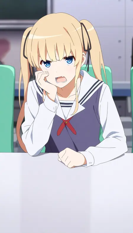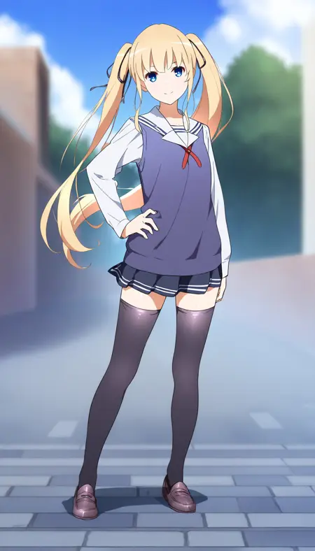 erir1, 1girl, solo, blonde hair, bangs, twintails, black hair ribbon, blue eyes, blue sweater vest, white shirt, sailor fuku collar, long sleeves, red tie, blue pleated skirt, purple thighhighs, brown loafers,