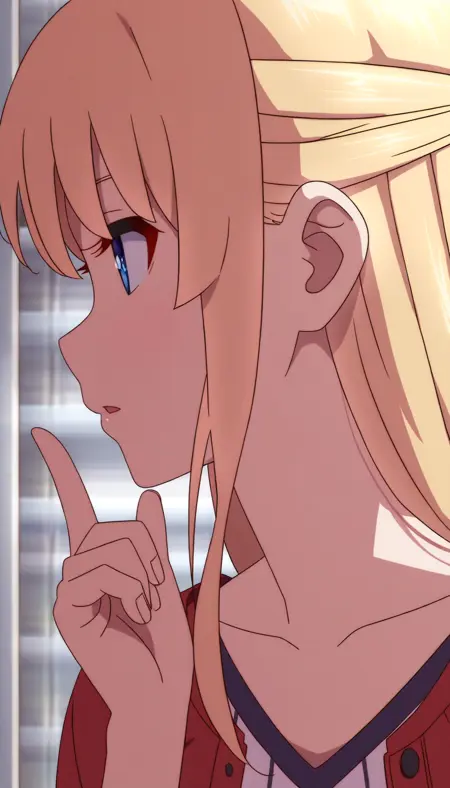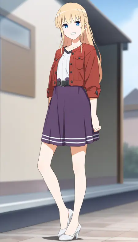 erir1, 1girl, solo, blonde hair, long hair, bangs, half updo, blue eyes, red jacket, white v neck blouse, purple high waisted pleated skirt, black belt, white low heels,