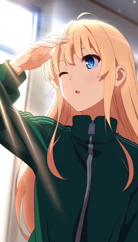erir1, 1girl, solo, blonde hair, bangs, long hair, blue eyes, green track suit, green track pants, purple socks, slippers,