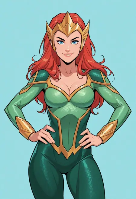 | 학습된 단어 | 1girl, solo, DC Comics, Mera, blue eyes, gold crown, red hair, long hair, green bodysuit, scaled bodysuit, scales, cleavage, long sleeves, gold wristbands, gold trim복사됨! Optional: Superpowers, water powers, water bending, floating hair,복사됨! Optional: weapon, trident, holding trident, gold trident,복사됨! |